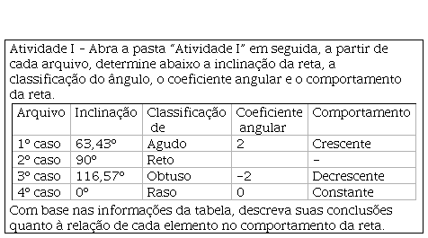 A atividade 1 teve por objetivo levar os alunos a relacionar a inclinação de uma reta no plano cartesiano com seu coeficiente angular e comportamento (realizando isomorfismo com a representação de uma função polinomial do 1º grau), a partir da análise de construções no GeoGebra de retas sem a exibição da sua equação. A seguir temos o comando da questão já com a resposta da atividade e a visualização do 1º caso.