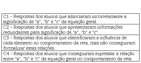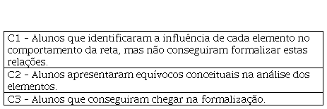 A categoria C2 representa a resposta de 25% dos alunos cuja conclusão foi redundante ou vaga em relação ao que fora proposto. Percebemos na própria resposta do A3 que este ratificou a influência dos coeficientes da equação geral para a determinação dos coeficientes angular e linear na forma reduzida. Acerca disto, ressaltamos que o ensino por atividades tem por finalidade a construção de noções matemáticas a partir dos objetivos de cada atividade, logo, é essencial que o aluno se permita a explorar seus conhecimentos e busque refletir em cada atividade, Caso contrário, este apenas estará realizando exercícios sem atribuição de significação ao que está sento estudado (SÁ, 2009; MENDES; SÁ, 2006).