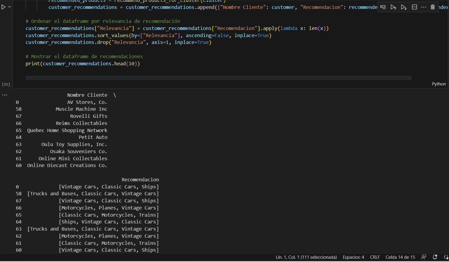 Para metodologías de Machine Learning, se utilizó scripts en Python (ilustracion 2) para determinar diferentes tipos de viabilidades, como patrones en la compra de los clientes y un sistema adicional de recomendación de compra con base en las compras anteriores realizadas por las personas.