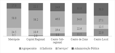Quanto às Capitais Regionais, sua atividade econômica correspondia a 56,2% do VAB pelo setor terciário, no ano de 2020. Ao descer a hierarquia urbana, diminui-se a participação dos Serviços no total do VAB dessas cidades, elevando-se a contribuição da APU. Nesse ano, a produção industrial dos Centros Sub-regionais representava 19,4% da sua atividade econômica e a produção agropecuária representava 8,8%. Já entre os Centros de Zona, essas cifras eram de 22,6% e 11,5%, respectivamente.