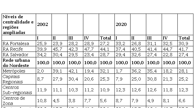 Pelo exposto, a forma como a atividade econômica está espacialmente distribuída pela região Nordeste é um componente relevante de sua dinâmica urbano-regional. Dessa maneira, o ritmo e o sentido do processo de urbanização da região colocam-se como aspectos centrais do que ocorreu ali nas últimas décadas. Assim, é importante considerar a estruturação dessa rede de cidades pela maneira na qual estão dispostas as atividades do setor terciário pelo território nordestino, constituindo suas centralidades.