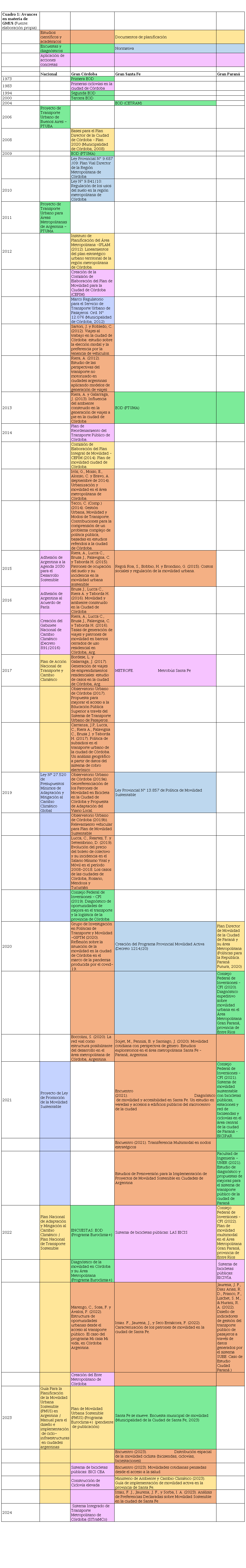La metodología aplicada consiste en un análisis documental y de datos obtenidos de diversas fuentes de información: resultados de encuestas de origen y destino (en adelante, EOD) y de movilidad domiciliaria, informes oficiales, estudios de diagnóstico, documentos de planificación urbana, normativa vinculada, artículos científicos y notas periodísticas y de opinión.[3] Tras el relevamiento, procesamos y sistematizamos la información de acuerdo a la fuente de origen y al tipo de documento y/o estrategia elaborada. De esta manera, los avances en GMUS quedaron organizados de la siguiente manera: a) Encuestas (EOD y de movilidad domiciliaria) e informes de diagnóstico; b) Documentos de planificación, normativa y aplicación de acciones concretas; c) Estudios científicos y académicos.