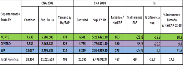 Partimos de reconocer que el proceso de concentración de la producción agropecuaria en Argentina manifiesta su continuidad incremental en los datos relevados del Censo Nacional Agropecuario 2018 (CNA 18) (Azcuy Ameghino y Fernández, 2019, García, 2020, Soverna, 2021). Sin embargo, hay que advertir que dicho proceso operó de manera diferencial en su estructura agraria y que, en el caso santafesino, la diversidad de condiciones agroecológicas y socio-productivas de su extenso territorio habilitan a reparar sobre los matices que dicho proceso presenta en cada uno de ellos. Por estos motivos, tal vez sea más pertinente referirnos a las estructuras agrarias (Margiotta y Benencia, 1995; García, 2020), más que a una sola estructura.
