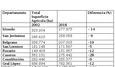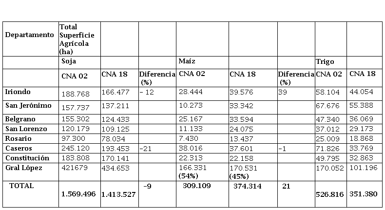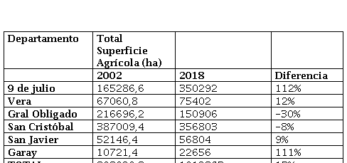 Los guarismos presentan un significativo incremento de la agricultura en los departamentos Garay y 9 de Julio, con una fuerte participación del cultivo de arroz en el primero sobre la ribera paranaense (de 1.148 ha en el CNA 02 pasa a 12.079 ha en el CNA 18) y de maíz en el segundo (de 6.369 ha en CNA 02 a 60.134 ha en el CNA 18). A partir de las entrevistas realizadas es posible sostener que este incremento del cultivo de maíz se vincula a la producción de carne en confinamiento.