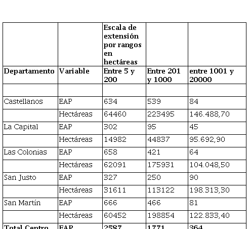 Pero también podemos encontrar una diferenciación en la zona sur con dos áreas: el este y el oeste, sobre todo el departamento General López que está apoyado sobre una tradición productiva ganadera, con una superficie media totalmente diferente al resto (Ver Cuadro XVI) dado que el este tiene una historia de colonización chacarera que explica gran parte de su estructura fundiaria.