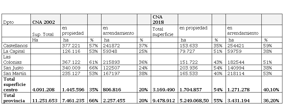 El centro de la provincia presenta características del ambiente chaqueño al norte y del pampeano al sur. Su relieve es suavemente ondulado a plano o deprimido en las cercanías de los arroyos y los ríos. Comprende los departamentos de Castellanos, La Capital, las Colonias, San Justo y San Martín. Sus características agroecológicas han permitido el desarrollo de la actividad ganadera vinculada al tambo y en menor medida la agricultura. En los últimos años la región sufrió profundas transformaciones, algunas de las cuales son reflejadas por la información que arroja el CNA 18. Sin embargo, como se mencionó anteriormente, es la zona con mayor diferencia en la superficie censada, un 30% menos respecto al CNA 02, por lo que se incorporan otras fuentes en el análisis.