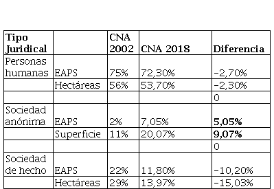 Esta cita también puede vincularse con los cambios en el tipo jurídico de las EAP entre los CNA trabajados. En el Cuadro VII podemos ver que tanto en el CNA 02 y CNA 18 prevalece el tipo jurídico de personas humanas, aunque se puede apreciar el aumento de las EAP de sociedad anónima y S.R.L. La disminución de la figura persona física es uno de los indicadores que nos permite inferir desaparición de productores de tipo familiar, tal como argumenta Sandoval (2023).[6]