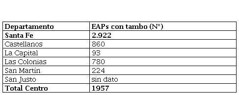 Una de las actividades agropecuarias vinculadas a la región centro es la ganadería de tambo. En los departamentos del centro hay 1.105 EAP con tambos que representan el 63% del total de la provincia (1.727). El mayor aporte lo representan los departamentos San Martín, Castellanos y Las Colonias.