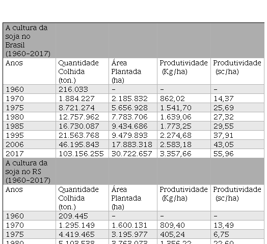 Para identificar elementos chaves da mudança de um sistema de produção hegemônico da pecuária extensiva para a produção agrícola no Rio Grande do Sul, buscamos aqui contextualizar como a cultura da soja foi introduzida e estabelecida no Brasil.