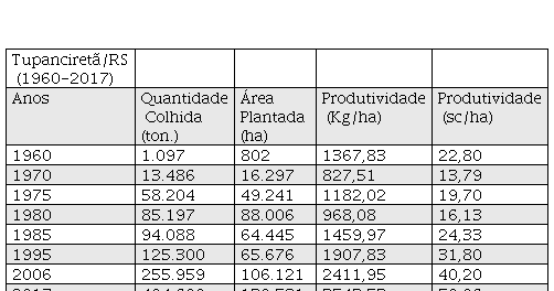 No Quadro IV podemos visualizar aspectos da produção de soja em Tupanciretã nas últimas décadas, a partir de dados dos Censos Agropecuários, onde o quantitativo da produção (em ton.), área plantada, e a produtividade por hectare aumentam. Isso ocorre por diferentes fatores, como o aumento da área plantada ao longo do tempo (mesmo com os novos recortes territoriais devido a emancipações de distritos), assim como o aumento da produtividade média, chegando próximo a 60 sacas por hectare.