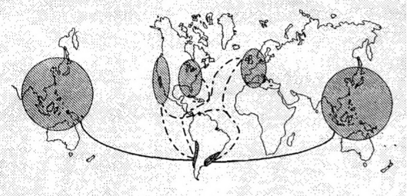 Este párrafo de Orthlieb resume en pocas líneas, la lógica de la configuración de la Gran Fábrica mundial que se encontraba en formación por esa década, y a la cual los países sudamericanos debían integrarse: 1) deslocalización y fragmentación de los procesos productivos, es decir, que las diferentes etapas del proceso se realicen en distintas localidades; 2) especialización territorial, definida en base a dicha deslocalización; 3) transferencia de recursos bioenergéticos (“materia prima” y trabajo humano) desde ciertas localidades hacia los centros de producción global; y 4) generación de valor (comercialización) en los centros de producción del Norte globa.l[14]