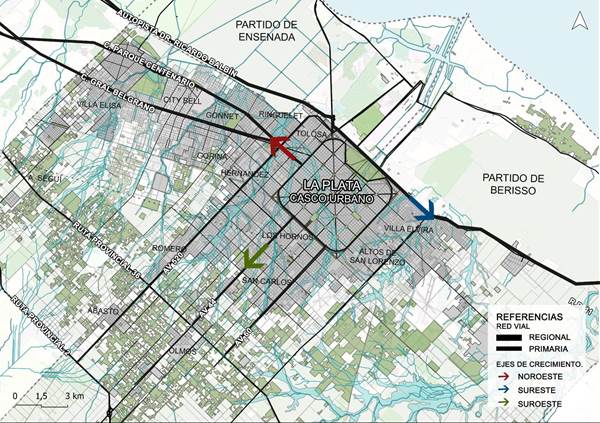 Luego, y una vez relevada la escala partido mediante imágenes satelitales, se procedió a caracterizar las transformaciones territoriales vinculadas al proceso de expansión urbana acontecidas en el mismo, plasmadas en cartografías a modo de diagnóstico. Las mismas evidencian diversas tendencias de expansión y la conformación de distintos tipos de periferias localizadas en relación a los principales ejes determinados a partir de la infraestructura vial que vincula el casco urbano de la Ciudad de La Plata con las demás delegaciones del partido.