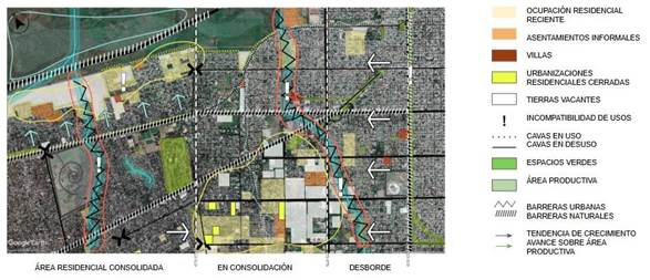 Luego de una aproximación a la delimitación de las áreas periurbanas, y en conjunto con los diagnósticos realizados en torno a cada eje de crecimiento urbano, se procedió a caracterizar los límites del área de interfase urbano-rural (Figura 7). Se identificaron allí aquellos sectores mayormente vinculados al uso residencial en el eje noroeste y sureste, mientras que en el eje suroeste se identificó una mayor relación con la actividad productiva. Cabe destacar que, si bien en los 3 ejes de crecimiento se identificaron conflictos socioambientales relacionados a la urbanización de zonas no planificadas y/o aptas para el uso residencial, como la cercanía a pasivos ambientales o planicies de inundación de cursos de agua, los sectores más afectados se localizan en el eje suroeste, y en menor medida, en el eje sureste.