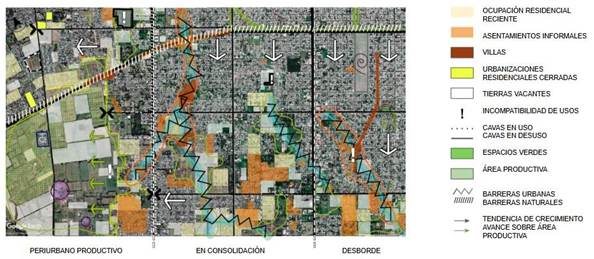 Entonces, estas áreas de interfase conjugan procesos simultáneos de atracción y expansión que se expresan en la configuración territorial por un alto grado de dispersión y baja densidad de ocupación, con impacto tanto sobre los entornos urbanos como sobre las áreas rurales (Rocca et. al., 2014). Se destaca la presencia de actividades hortícolas, intercaladas con usos residenciales, industriales y de saneamiento, entre otros, que en muchos casos manifiestan conflictos urbano-ambientales vinculados con la incompatibilidad de usos resultante de la heterogeneidad característica de estos espacios (Zulaica, et. al., 2020). Se configuran lugares de transición, híbridos, que acogen actividades expulsadas de la ciudad junto a actividades propiamente rurales, generando una percepción de desorden. Los paisajes periurbanos se caracterizan por estar sometidos a una presión urbanística, industrial y de infraestructura muy grande, y la competencia por el uso del suelo ha terminado, a menudo, convirtiendo a la agricultura en una actividad residual (Nogué, et. al., 2014).
