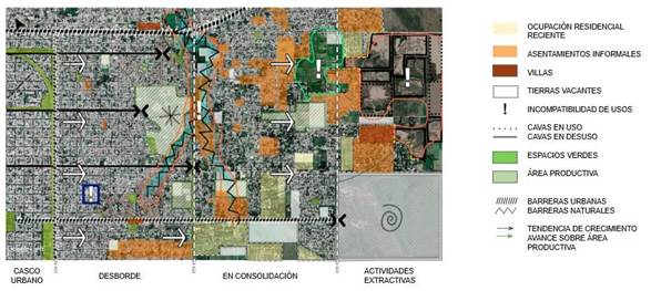 El estudio de dichas periferias permitió identificar los usos predominantes y conflictos socio-territoriales presentes en las mismas, y a su vez, reconocer y delimitar aquellos sectores de interfase urbano-rural circundantes al área urbana caracterizándose principalmente por su mixtura de usos (Figura 6). Para ello se llevó a cabo la integración de diversas variables como la zonificación actual del partido y los usos reales del suelo, los grados de consolidación, el sistema de espacios verdes y de cursos de agua, los espacios vacantes, y los asentamientos informales, entre otros.