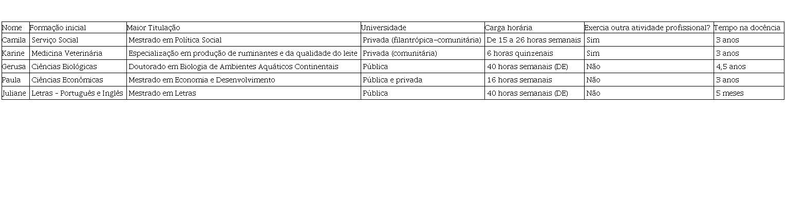 Coincidentemente, todas as pessoas que se dispuseram a colaborar foram mulheres, as quais receberam os seguintes nomes fictícios, para preservar suas identidades: Camila, Karine, Gerusa, Juliane e Paula[5].. Na tabela 1 apresentamos algumas informações sobre o perfil profissional destas ex-professoras: