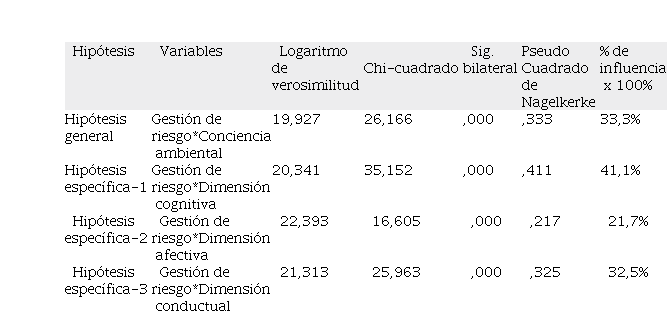 Analizando los valores de la hipótesis-general se demuestra que la variable gestión de riesgo presenta influencia sobre la conciencia ambiental de 33,3% de acuerdo con el índice del pseudo cuadrado de Nagelkerke 0,333 y al p valor de 0,000.