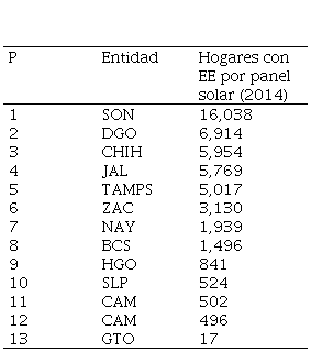 El propósito de este texto es concentrarse en los hogares mexicanos que se alimentan de energía eléctrica a través de paneles solares. Los datos que arroja la Encuesta Nacional de Gastos de los Hogares (ENGASTO) 2013 del INEGI, es que solamente 13 estados reportaban hogares con panel solar (véase la Tabla No. 1), siendo Sonora el Estado puntero en el fomento de paneles solares en los hogares, seguido por Durango, Chihuahua, Jalisco y Tamaulipas.