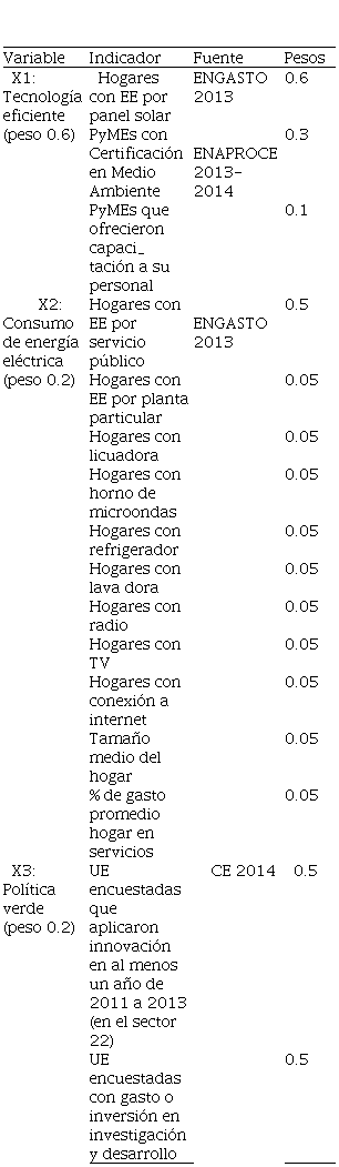El IICS se compone de tres ámbitos, los mismos que ya fueron descritos de acuerdo con el enfoque de “Eficiencia energética desde el contexto de las ‘buenas prácticas’ y las energías limpias” (véase Figura No. 2). Los ámbitos se conforman de indicadores que cumplen con las características mínimas como disponibilidad y economía, es decir, las fuentes de donde han sido tomados son oficiales, INEGI (véase Tabla No. 2). Cada ámbito corresponde a una variable.