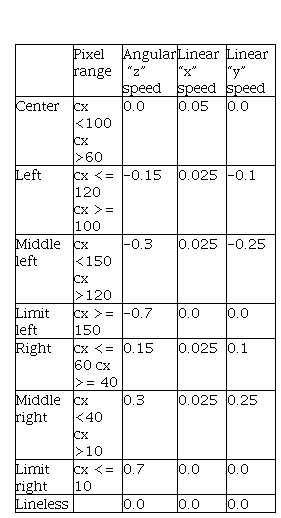 The six red lines drawn in the quadcopter video determine 7 areas. These lines are distributed according to the width in pi-xels of the processed video which in this case is 160 pixels, each determined area obeys different decisions by the quadcopter if the centroid of the line detected is found. This is interpreted as different movement speeds what will try to head the quadcopter to the central area. In addition, in the case where there is no line to follow found in the video, the quadcopter stops moving. Table 1 shows the relation ship between the published speeds to the topic /bebop/cmd vel and the area where is located the centroid of the line to follow. It is important to emphasize that thecx coordinate is a parameter given by the centroid of the detected line and it is fixed in a range of 0 to 160 as well as the width of every video frame.