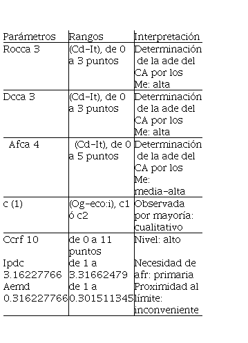 En la tabla 5 se interpretan los parámetros de los requerimientos de los ocupantes (Rocca) con determinación de la apariencia definitiva edilicia (ade) del continente arquitectónico (CA) con rango de 3 puntos se otorgó un valor alto, en las determinantes del contexto (Dcca) con valor de 3 interpretada como alta, enlos atributos formales del continente arquitectónico (Afca) con valor de 4 interpretada como media-alta.
