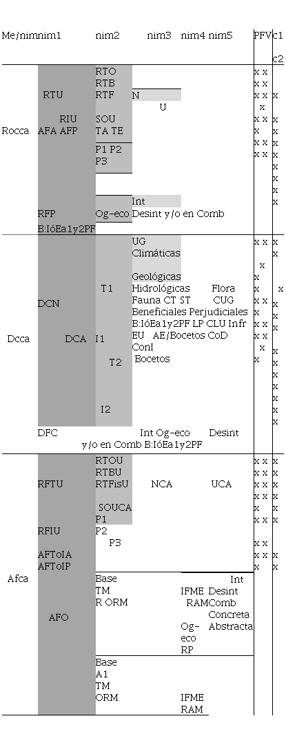 En los modeladores eventuales se observan números a su lado, este número es el nivel informativo máximo (nim) que van del 1 al 5, estos números están predefinidos y son constantes en la tabla base y se observan en la tabla 1 en la parte superior, al comenzar a rellenar las tablas de Rocca, Dcca y Afca simplemente se le pone el número que lleva el acrónimo conforme al lugar que tenga en la tabla 1 de Modeladores eventuales (Me).