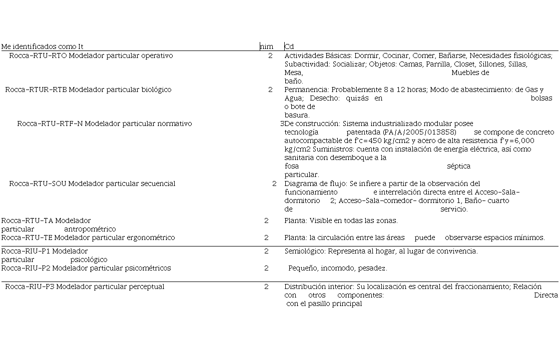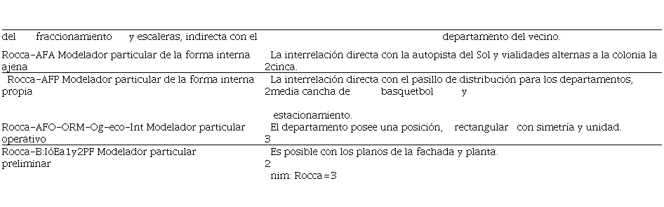 El Sistema para Valorar al Diseño Arquitectónico Edilicio (SIV-DAE) fue de ayuda gracias a su tabla base de modeladores eventuales (Me), en la cual solo se subrayan o tachan los acrónimos necesarios que corresponden directamente al estudio de caso como se muestra en la Tabla 1. El Rocca como se pudo observar, la tabla 2 analiza el objeto de estudio que es la vivienda del fraccionamiento, la tabla 3 el Dcca el contexto natural y artificial finalizando con la tabla 4 el Afca lo que sería el fraccionamiento, lo que permitió recabar información específica.