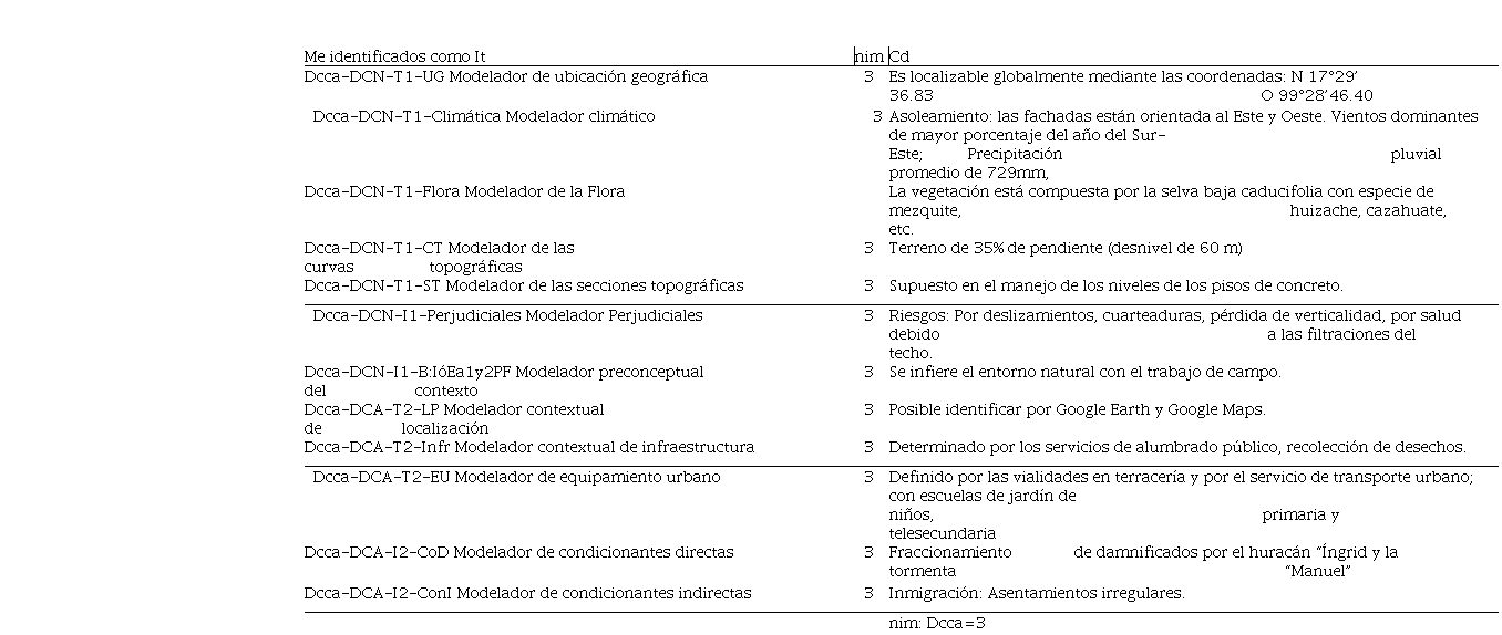 A continuación, se muestra la información obtenida con el Sistema para Valorar al Diseño Arquitectónico Edilicio (SIV- DAE) en el cual se hace la identificación de los modeladores eventuales (Me) se emplean como sinónimos de los términos de origen, causa o “chispa”. Utilizados regularmente en el desarrollo de los procesos generales del diseño (Saíns, 2005, pág. 58 citado por Elizalde), (Seia, 2014, pág.16 citado por Elizalde, 2019b, pág. 3) (Tabla 1) los modeladores eventuales (Me) se clasifican en diversos niveles informativos máximos (nim1, nim2, nim3, nim4, nim5) estos representan el valor total alcanzable documentalmente y se miden del 1- 11. (Elizalde, 2019b, pág. 16)