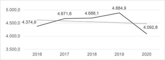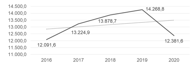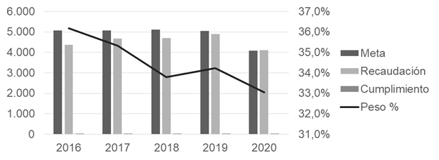 En consecuencia, con estos datos se puede observar que el cumplimiento de la meta del 2016 al 2019 no se alcanzó y aunque en el 2020 se cumple, esto se debe a un ajuste de la meta por problemas externos como la pandemia ocasionada por el COVID-19, si se consideran los valores recaudados del 2016 al 2019 existía un incremento mínimo que en el 2020 cae por los temas antes mencionados. En lo relacionado al peso porcentual del IVA en relación con el total recaudado por la institución, se puede observar un descenso casi continuo desde el 2016. Para una mejor apreciación visual, se presenta de forma gráfica estos datos, en donde, se puede apreciar la tendencia negativa de los valores recaudados en los últimos cinco años.