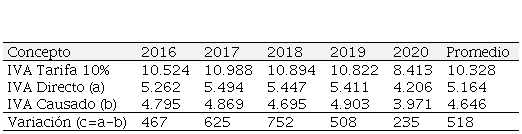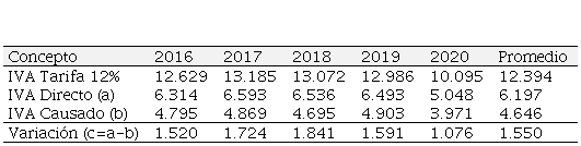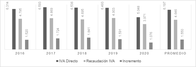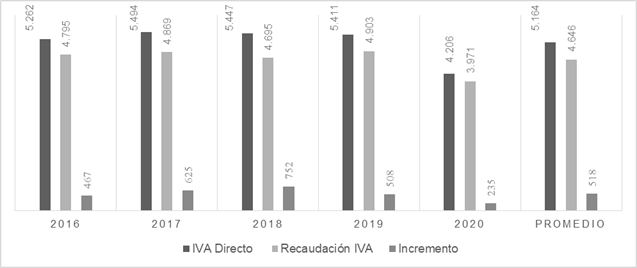 De los valores presentados se calculó el 50% del impuesto causado que con las reformas normativas los contribuyentes deberán cancelar de forma directa y se consideró el impuesto al valor agregado que se hubiera generado en los últimos cinco años con la aplicación de la propuesta comparándolo con la recaudación generada en el mismo periodo con la normativa actual y de estos datos se estableció el promedio de recaudación potencial. En síntesis, la aplicación de la propuesta aun reduciendo la tarifa del IVA al 10%, que estimularía a la economía, generaría de manera proyectada un incremento promedio de 500 millones de dólares al que está recaudando actualmente por este impuesto el Servicio de Rentas Internas, al que se le podría adicionar valores a pagar del 50% restante del impuesto causado al que se puede descontar créditos tributarios.