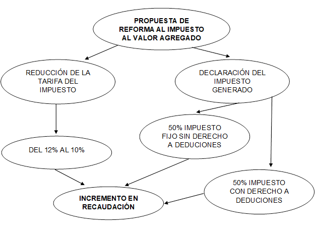 La propuesta del cambio de la tarifa del 12% al 10% del IVA, generará aceptación social al cancelar menor impuesto en sus adquisiciones de bienes y servicios, reactivando la economía; y, la aplicación del pago directo del 50% del IVA causado luego de la aplicación de la normativa de ventas a crédito, no afecta directamente al contribuyente que declara, ya que son valores que el recauda de sus clientes como agente de percepción; además, el contribuyente puede incluir en sus gastos el IVA que no pueda utilizar como crédito tributario de acuerdo a la norma. La aplicación de la propuesta proyecta un incremento promedio de 500 millones de dólares al que está recaudando actualmente por este impuesto el Servicio de Rentas Internas.