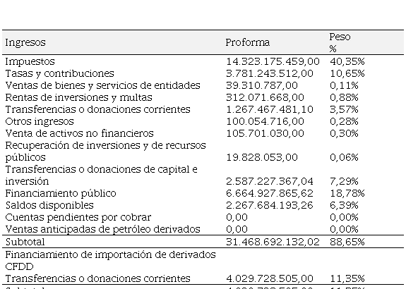 Actualmente en Ecuador de acuerdo a las normas legales, los tributos se dividen en tres grupos, los impuestos, que son los más importantes; luego se encontró las tasas y por ultimo a las contribuciones especiales o de mejora (Asamblea Nacional, 2005), los impuestos son una prestación al Estado, principalmente en dinero; las tasas aquellos valores que se cancelan por el servicio del Estado; y, las contribuciones especiales o de mejora, que generan valores a cancelar al Estado por beneficios relacionados principalmente por la obra pública, Blacio (2012). Dentro de este contexto, se presenta a continuación datos de la proforma de ingresos del Presupuesto General del Estado del ejercicio 2020, que actualmente establece la estructura de las fuentes de financiamiento de un Estado, para analizar sus datos: