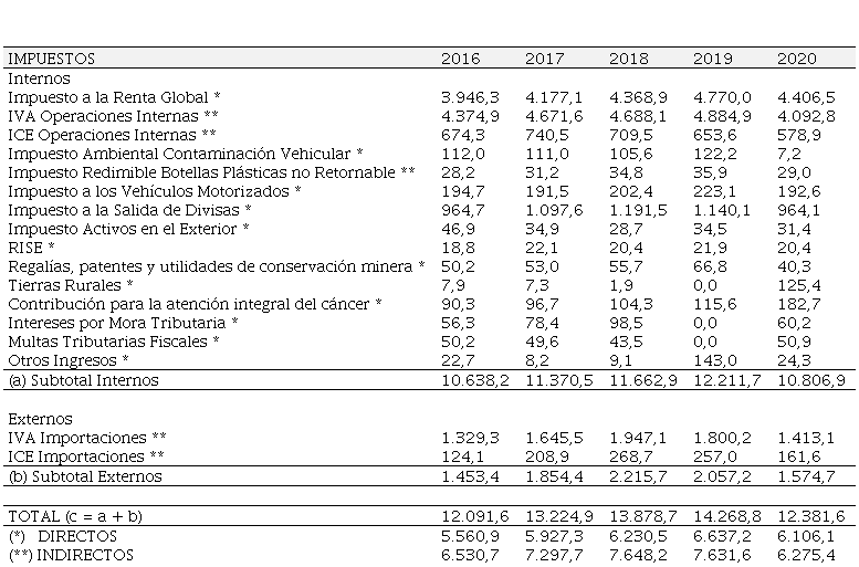 Es preciso considerar que el principal impuesto recaudatorio que administra el Servicio de Rentas Internas en casi la totalidad de los cinco años analizados es el IVA y en segundo lugar se encuentra el Impuesto a la Renta, estos impuestos son los más relevantes tomando en cuenta la recaudación por tipo de impuesto, es decir, estableciendo que el IVA representa el principal impuesto indirecto y el impuesto a la renta como el principal impuesto directo. Además, en la tabla 2 se puede visualizar el IVA Interno que recauda el SRI y el IVA Externo que recauda el Servicio Nacional de Aduana del Ecuador (SENAE) al momento de nacionalizar productos en las aduanas a nivel nacional. En el periodo 2020 se ve una caída en la recaudación principalmente por la contracción en la economía del país, debido a la pandemia del COVID-19 en donde varios sectores debieron cerrar sus negocios por las medidas de bioseguridad determinadas por el Estado.