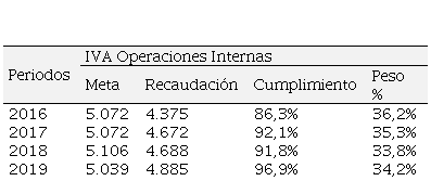 Como datos relevantes el IVA se genera con el valor de la transferencia de dominio o a la importación de bienes muebles, en cada una de las etapas de comercialización, existen productos gravados con tarifa del 12% y tarifa del 0% y se declara mediante el formulario 104 al Servicio de Rentas Internas. A continuación, se presentan datos importantes publicados por el servicio de Rentas Internas sobre el IVA, como la meta que se había planteado en cada periodo, la recaudación obtenida, el porcentaje de cumplimiento con respecto a la meta y el peso porcentual del impuesto sobre el total de la recaudación obtenida por la entidad.