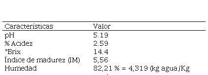 En la Tabla 1 se observa los resultados fisicoquímicos realizado a la pitahaya amarilla fresca antes de someter al proceso de deshidratación. Rodríguez et. al. (2005) determinaron: pH 5,05; % de acidez 2,54; índice de madurez 5,00; humedad 83,18 % y 14 °Brix. Se observa una semejanza en los resultados. Ayala et al. (2010) determinó: humedad 84,14 %, índice de madurez 4 y ,23 Brix. Esta diferencia en el contenido de humedad se debe a la procedencia e índice de madurez de la pitahaya.