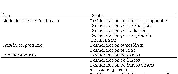 Entre los procesos de deshidratación se tiene la de convección, conducción, radiación, osmótica, natural y por congelación, lo que tienen en común según Andrade y Manosalvas (2015) es que su finalidad es remover el agua en su totalidad formando un producto sólido. Para Galeano (2018) y Colina-Irezabal (2010) donde resaltan la importancia de este método en la actualidad constituyendo uno de los métodos de conservación de alimentos más utilizados para la manufactura de productos, el proceso de deshidratado se completa cuando el peso del producto tiende a equilibrarse, es decir, cuando la variación del peso del sólido es casi nula hay una tendencia a que el peso se mantenga constante.