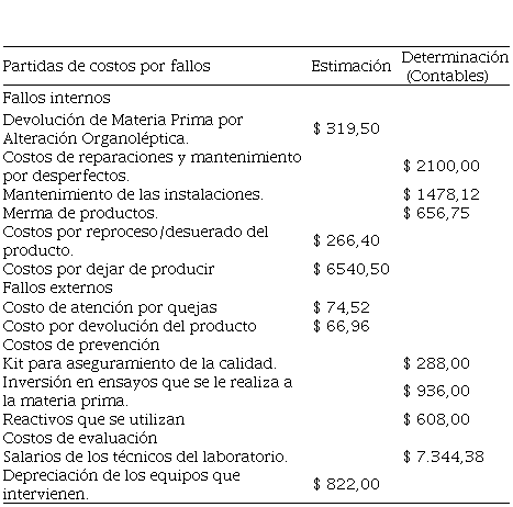 Una vez aplicado el proceso de recopilación de información en los talleres de producción y determinado los costos asociados a los fallos internos y externos se pudieron generar las partidas de costos, los mismos se muestran en la Tabla 1; donde se determinaron partidas de costos por estimación dada la ausencia de datos contables y aquellos por determinación o contables, facilitados por el área de contabilidad.