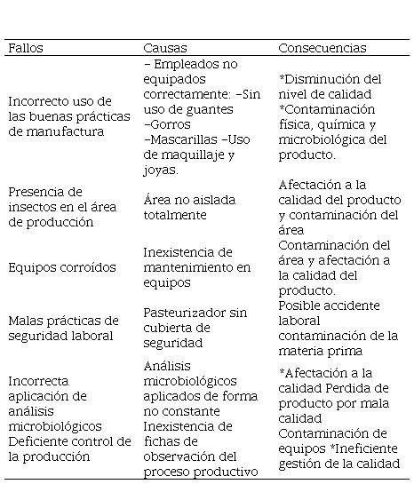 Además, identificando los fallos no cuantificables se puede detectar que los procesos de producción no cumplen los requerimientos necesarios para ser considerados de calidad; su alcance por una parte no infiere en la decisión de compra del producto por los clientes internos y externos, pero por otro lado denota inconsistencias técnicas internas en la elaboración del queso que deben ser corregidas, entre los cuales se pueden encontrar el incorrecto uso de las Buenas Prácticas de Manufactura (BPM), malas prácticas de seguridad laboral, incorrecta aplicación de los análisis microbiológicos o inconsistente adecuación de las instalaciones (Tabla 2).