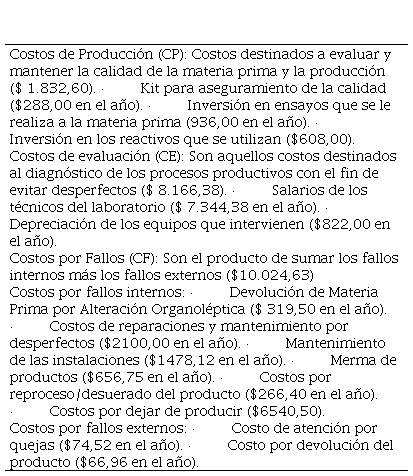 El control de los costos de calidad facilitó a la organización tener un registro adecuado de los montos destinados a prevenir los fallos, con el fin de garantizar la calidad de los procesos productivos; además, permite evidenciar aquellos que pasarían desapercibidos por no ser frecuentes en toda organización. Se evidencia que la intervención mediante los grupos de mejoras, al implementar medidas correctivas por medio de los costos de calidad asociadas a Buenas Prácticas de Manufactura, tienen un efecto positivo elevando la competitividad de los procesos y ejerciendo cambios que proveen óptimos índices de calidad según las ratios comparados antes y después de la intervención; donde la valoración cuantitativa paso de regular a buena.
