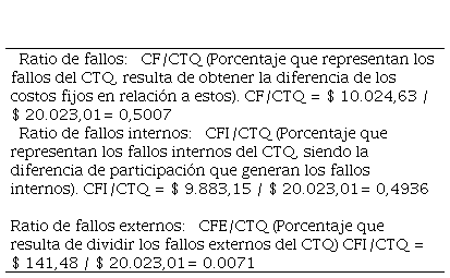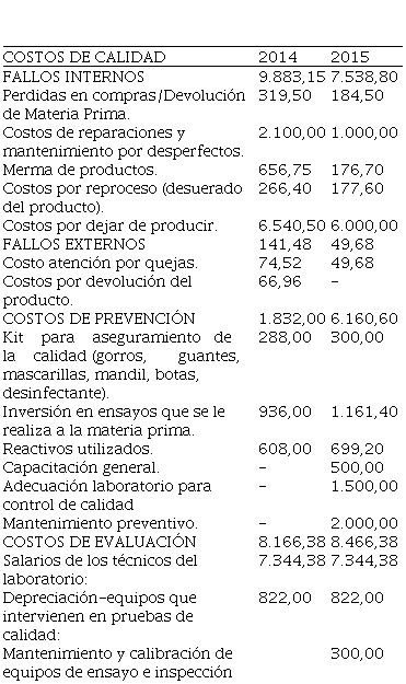 Los costos de fallos para el 2014 representan el 50,07 % de los costos totales de calidad en el período; de los cuales, el 49,36% corresponden a fallos internos y el 0,71% restante se encuentran vinculados a los fallos externos, de los cuales se evidenció como diagnóstico preliminar que los principales inconvenientes se encuentran vinculados al área de producción, relacionados a la devolución de materia prima por alteración organoléptica, reparaciones y mantenimiento por desperfectos, merma de productos, costos por reproceso, vinculados al desuerado del producto y costos por dejar de producir. Es decir, cuentas que de haberse presentado mayor inversión en los costos de prevención se podrían haber evitados.