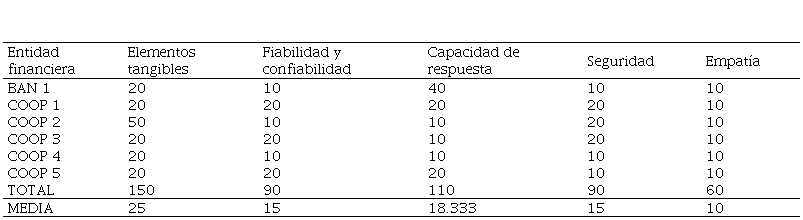 En lo que respeta a la Tabla 3 se denota que los aspectos más importantes para los clientes dentro de estas entidades financieras objetos de estudio, son elementos tangibles valorados con una media de 25 y capacidad de respuesta de 18,33. Es decir, para los clientes de las 6 entidades financieras del cantón los aspectos que más influyen en la prestación de un servicio son las 2 dimensiones antes mencionadas, seguido de confiabilidad y seguridad con una valoración de 15, y la empatía siendo el menos importante.