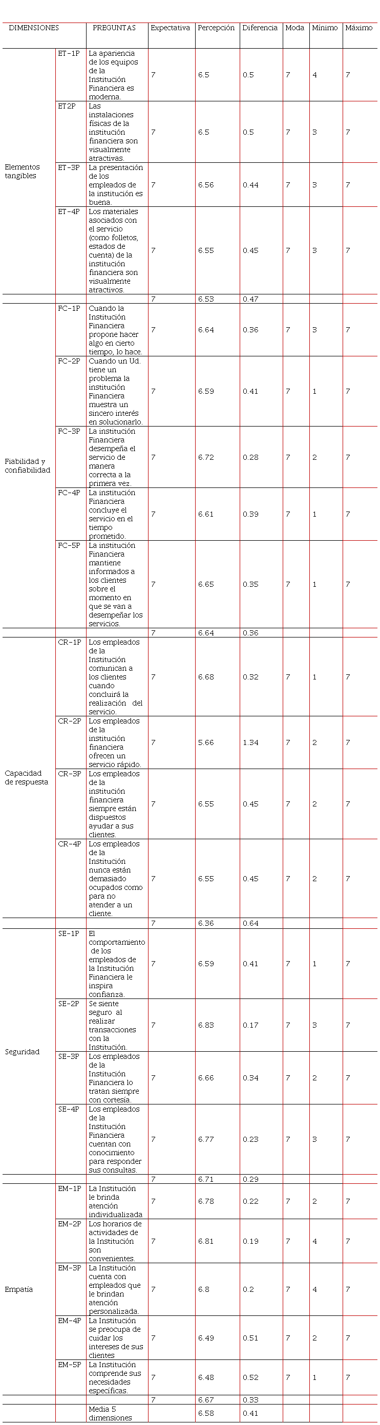 Dentro de esta cuarta dimensión se determinó 2 aspectos importantes tales como: si el comportamiento de los empleados le inspira confianza con una diferencia de 0,41 y por otra parte si los empleados le tratan con cortesía con el 0,34. Dentro de esta dimensión la media entre las expectativas y las percepciones es de 0,29. Esto hace referencia a que los empleados de las distintas entidades financieras no inspiran confianza en tu totalidad y tampoco tratan a sus clientes con cortesía, y también poseen una puntuación mínima de 1.