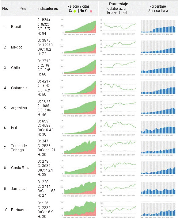 Categorizando según índice h (véase clasificación en Tabla 7), las primeras 5 participaciones – Brasil, México, Chile, Colombia y Argentina – coinciden con los países con mayor cantidad de revistas científicas de Latinoamérica (Tabla 3). Sin embargo, Perú sin tener revistas científicas nacionales, on h30 (país que cuenta con 30 artículos con al menos 30 citaciones) ocupa el sexto lugar de la región. Algo similar ocurre con Trinidad y Tobago, Costa Rica, Jamaica y Barbados.