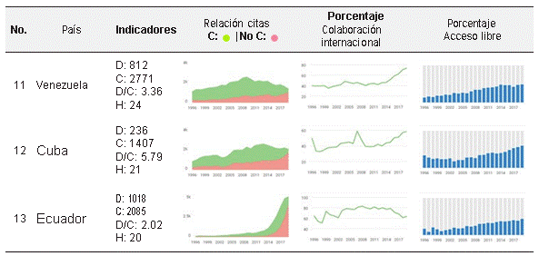 La tercera columna de la tabla 7 presenta para cada país: cantidad de documentos citables (D), citaciones recibidas (C), promedio de citaciones por documento (D/C) e índice h (H). Las gráficas presentadas en cuarta columna exponen una relación de las citas, el área verde representa el total de documento citados al menos 1 vez en los últimos 3 años y el área roja representa los documentos no citados en los últimos 3 años.