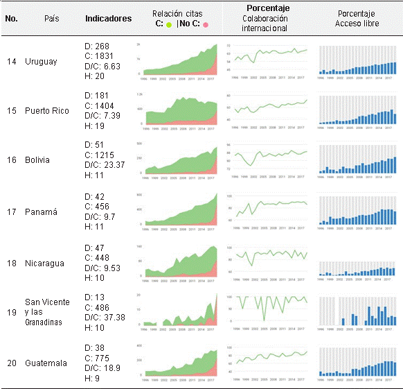 En las Figuras 7 y 8 se presenta la clasificación de los 20 países de la región con mayor índice h. Asimismo, se analizan otros indicadores como documentos citables, citaciones recibidas, promedio de citaciones por documento, relación de citas, porcentaje de colaboración internacional y porcentaje de acceso abierto.