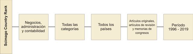 En la primera etapa, el universo censal estuvo conformado por 1 448 revistas científicas procedentes de todos los países del mundo indizadas en Scopus, registradas en la categoría “negocios, administración y contabilidad” al 2019. Si bien no fue necesario aplicar criterios de exclusión, es importante resaltar que sólo se consideraron revistas científicas; quedando fuera del universo de interés: revistas de negocio, serie de libros, conferencias y congresos. El periodo de tiempo abarcó todos los años disponibles en esta base de datos a enero 2021, es decir de 1999 a 2019. Los criterios de selección mencionados se muestran de manera gráfica en la Figura 1.