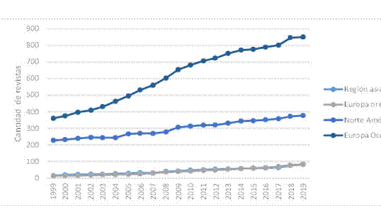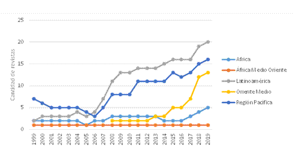 El abordaje partió por observar el comportamiento en un periodo de veintiún años del total de revistas científicas indizadas en Scopus, considerando las siguientes regiones de origen: Asia, Europa Oriental, Norte América, Europa Occidental, África, África Medio Oriente, Latinoamérica, Oriente Medio y Región Pacífica (ver Figura 3).