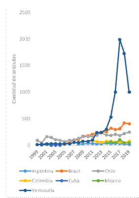 El comportamiento histórico ha presentado fluctuaciones en el periodo analizado: si bien China ha incrementado considerablemente su participación en número de publicaciones de 1996 a 2019, su producción científica no es constante, presenta incrementos y descensos bruscos a lo largo de los años; algo similar sucede a nivel Latinoamérica en los casos se Venezuela y Cuba.