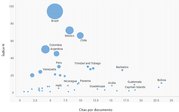 Hasta el momento se ha analizado el impacto de publicaciones científicas difundidas a través de revistas Latinoamericanas, a continuación se presenta el análisis desde la perspectiva de los países y sus investigadores.
