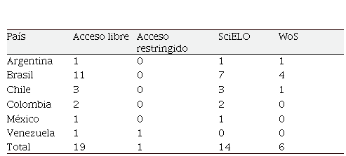 Con datos al 2019, la Tabla 1 presenta una síntesis de las 20 revistas latinoamericanas indexadas en Scopus, se observa los siguiente: el 95% son de acceso abierto, la única revista de acceso restringido es la venezolana Espacios, que al 2021 ha sido suspendida; SciELO incluyó 14 y WoS 6; la única revista argentina presente es Mundo Agrario, está también en SciELO y WoS; Brasil tiene 11 revistas de las cuales 7 están indexadas en SciELO y 4 en WoS; las 3 revistas de Chile están en SciELO y 1 en WoS; Colombia y México tienen 2 y 1 revistas indexada en SciELO respectivamente.